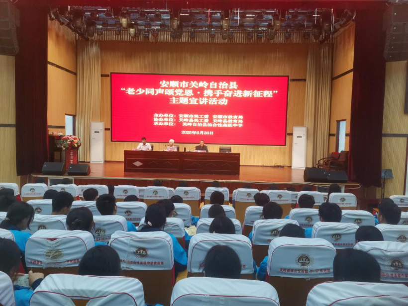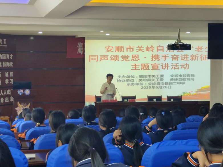 近日,安顺市“五老”宣讲团成员到关岭自治县综合性高中、关岭自治县第二中学开展“老少同声颂党恩·携手奋进新征程”主题宣讲活动,引导青少年传承红色基因,厚植家国情怀。